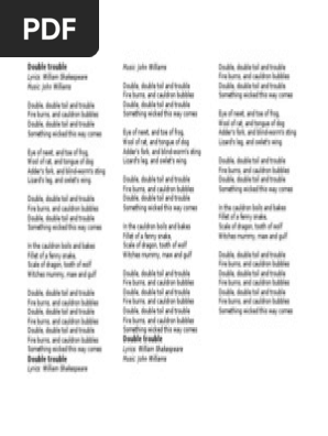 Gif. Double, double toil & trouble. Browse our 17 arrangements of double trouble. sheet music is available for piano, voice, alto saxophone and 15 others with 5 scorings and 1 notation in 2 genres.
